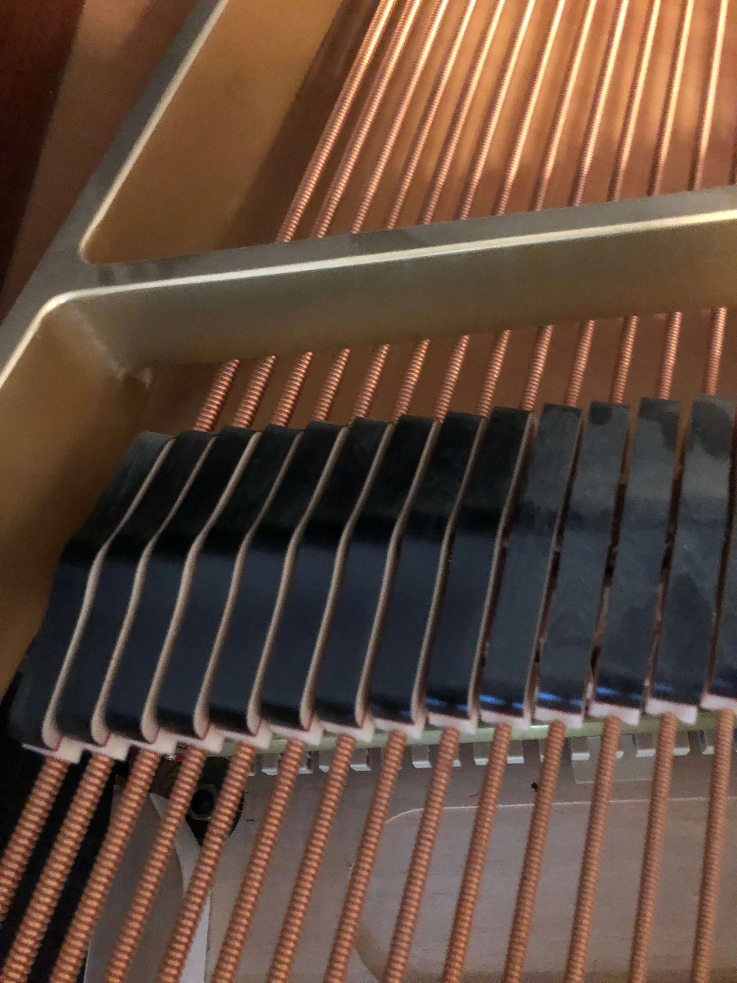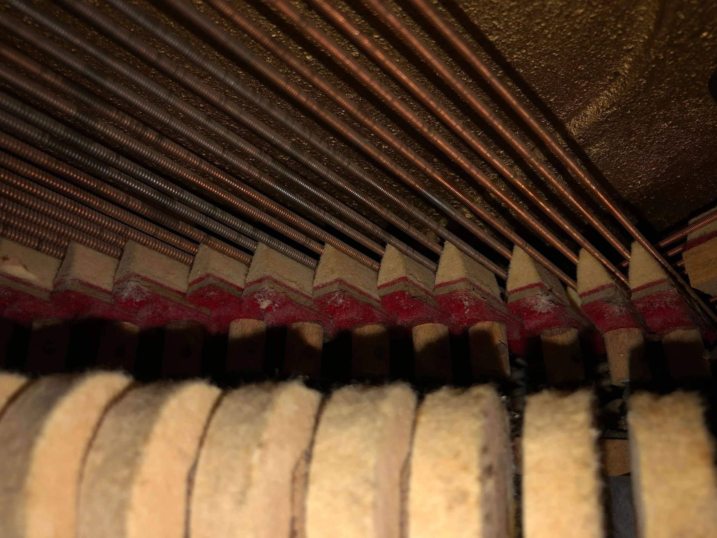 The piano hammers are constantly hitting the strings while the instrument is being played. Over time grooves will appear in the felt of the hammers which affects the tone. Unlike touch-up voicing, I will go through every hammer and needle, reshape, and/or iron as needed. These actions will alter the composition of the felt and eliminate hammer grooves thereby improving the tone. Cost: $120